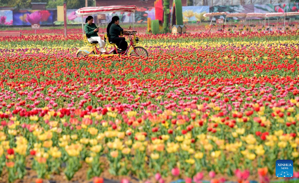 Tourists view tulips at a scenic spot in Suiping County, central China's Henan Procince, April 7, 2022. (Xinhua/Zhu Xiang)