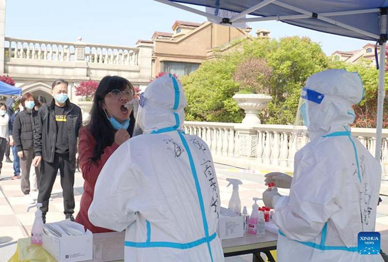 Medical workers from Hainan Province take swab samples from residents for nucleic acid tests at a community in Jiading District of Shanghai, east China, April 6, 2022. (Xinhua/Wang Shujuan)