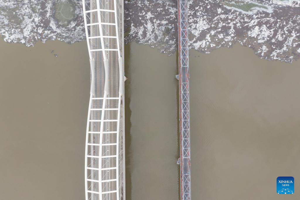 Aerial photo taken on April 8, 2022 shows the Songhua River in Harbin, northeast China's Heilongjiang Province. Ice flow occurred on Thursday in the Harbin section of Songhua River, according to Heilongjiang Province Hydrology and Water Resources Center. The date was one day earlier than in previous years. The water level stood at 116.29 meters and the amount of water flowing per second reached 1,100 cubic meters. (Xinhua/Xie Jianfei)