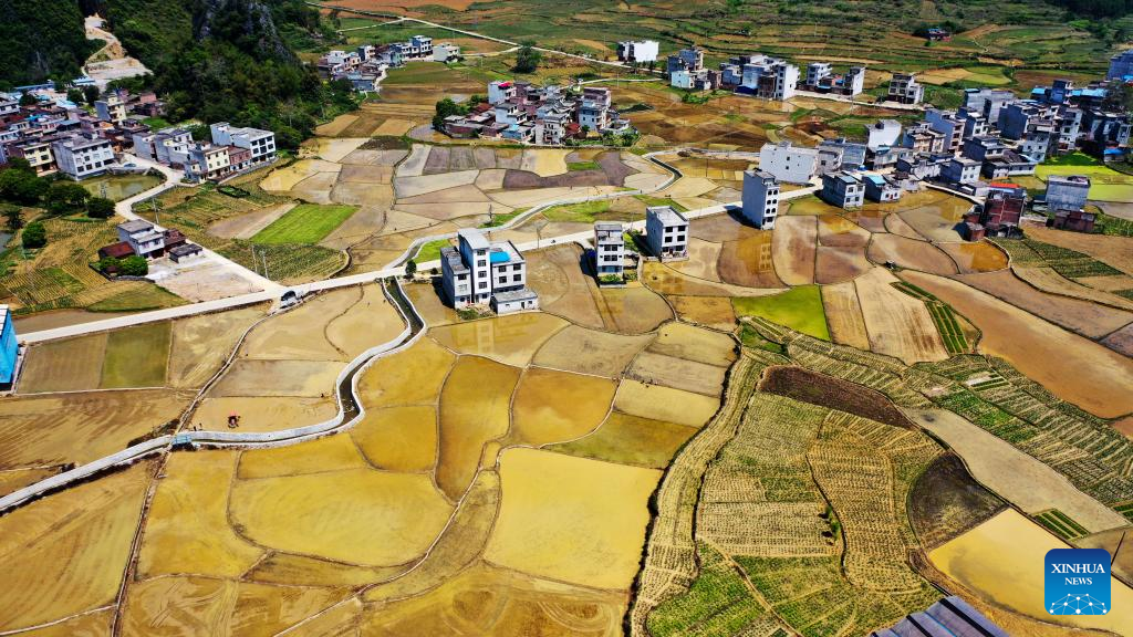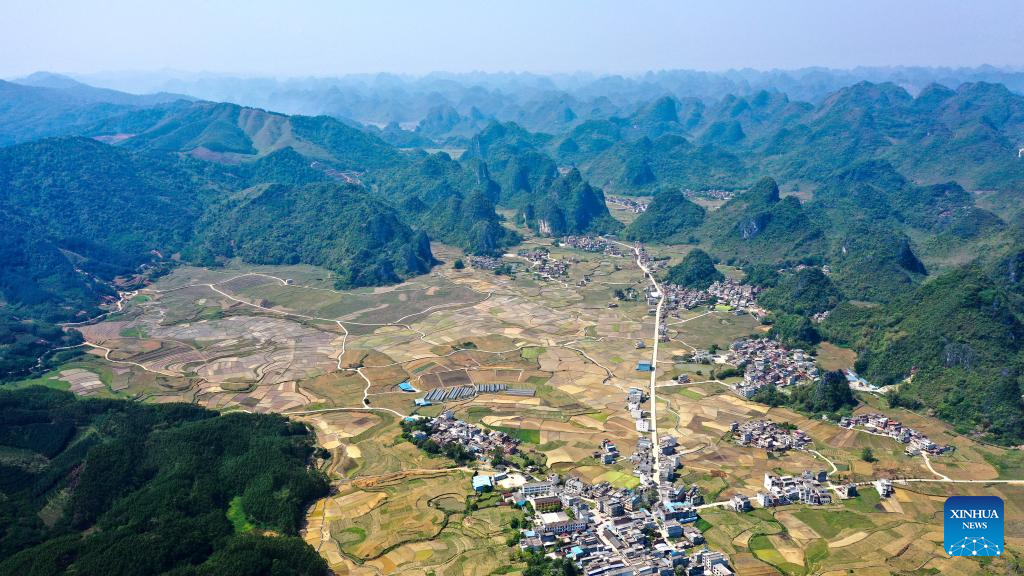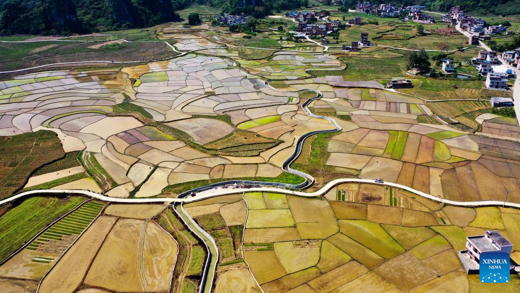 Aerial photo taken on April 8, 2022 shows the scenery of a planting base of selenium-rich rice in Longkou Village of Dahua Yao Autonomous County, south China's Guangxi Zhuang Autonomous Region. (Xinhua/Zhang Ailin)