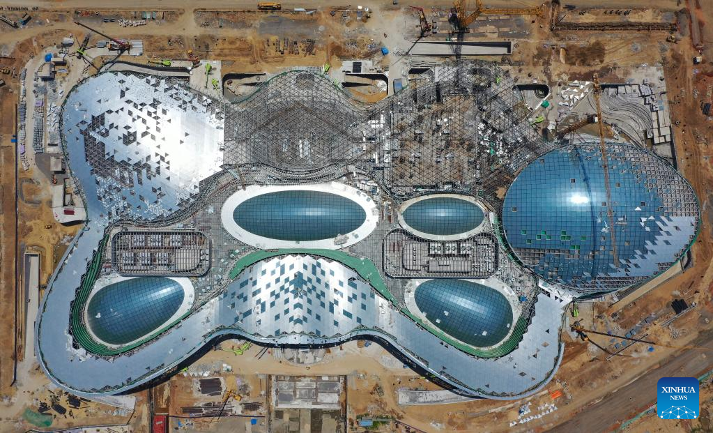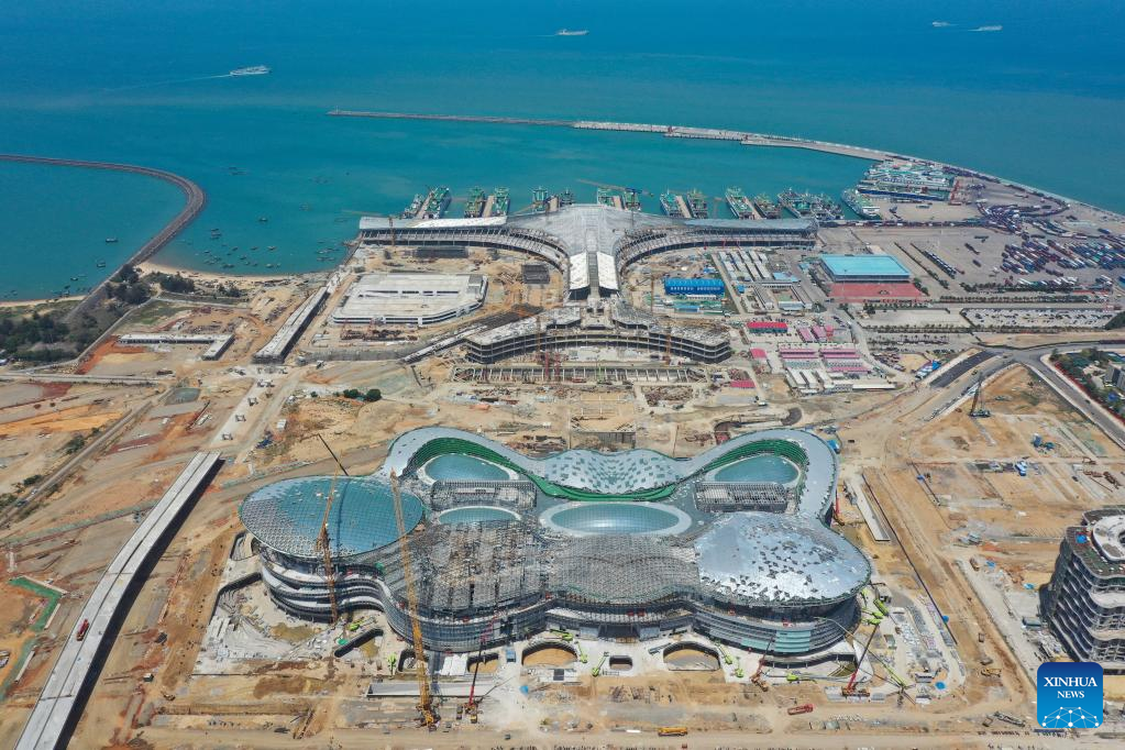 Photo taken on April 10, 2022 shows the construction site of Haikou duty-free shopping complex in Haikou, south China's Hainan Province. With a total construction area of about 926,000 square meters, the Haikou duty-free shopping complex project is expected to be officially put into use this year. (Xinhua/Guo Cheng)