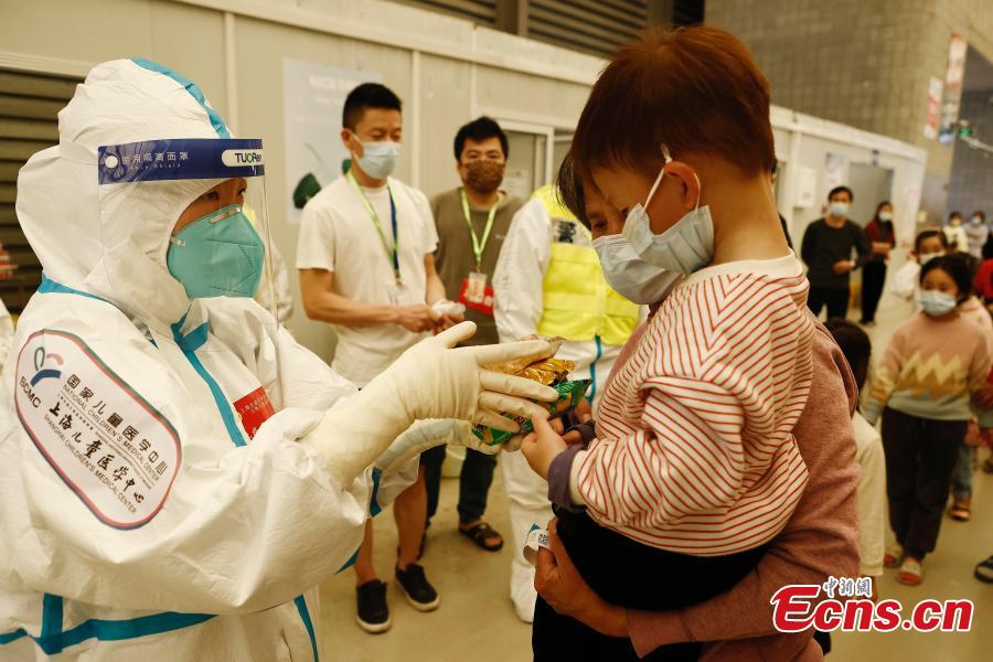 Medical staff distribute food to a child patient in the quarantine zone at the Shanghai New International Expo Center, east China's Shanghai, April 10, 2022. (Photo: China News Service/Yin Liqin)