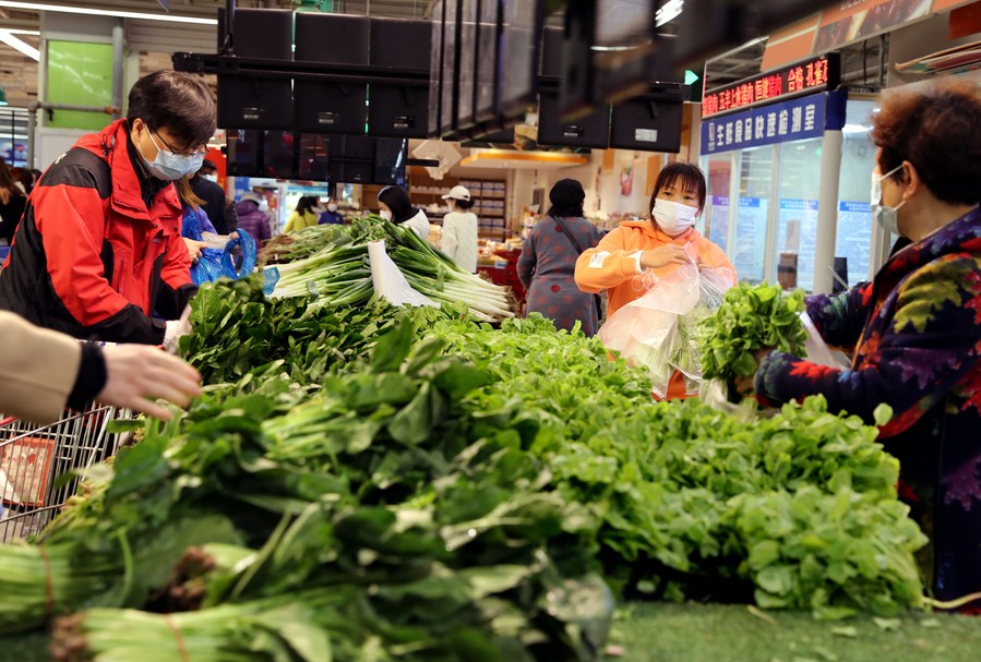 Residents buy vegetables at a supermarket in Putuo District of east China's Shanghai, March 31, 2022. (Xinhua/Liu Ying)