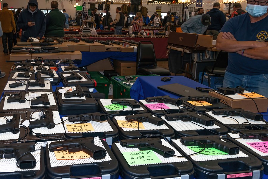 Guns are on display at the Dallas Gun Show in Parker, a suburban city of Dallas, Texas, the United States, Jan. 22, 2022. (Photo by Lin Li/Xinhua)