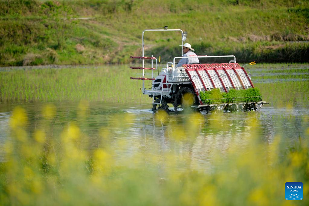 A technician operates a farming machine in rice paddies in Nanqiao Village of Guang'an City, southwest China's Sichuan Province, April 11, 2022.