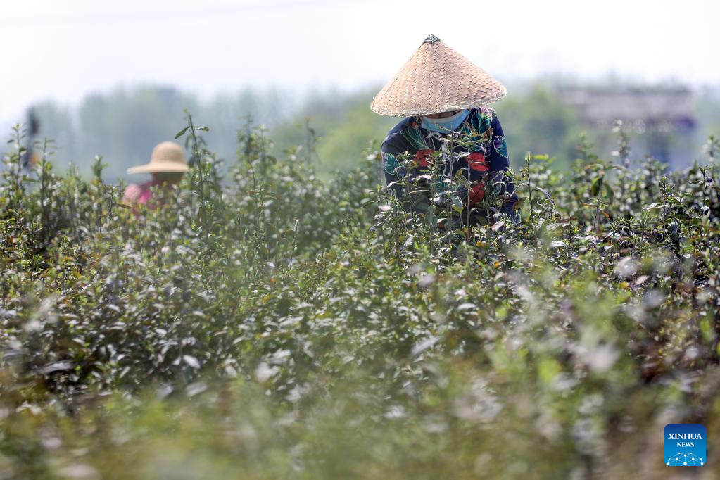 Farmers tend flowers at a flower farm in Tancheng County in Linyi, east China's Shandong Province, April 11, 2022.