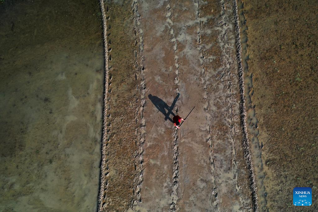 In this aerial photo, a farmer works in rice paddies in Qianjiang District of southwest China's Chongqing, April 11, 2022.