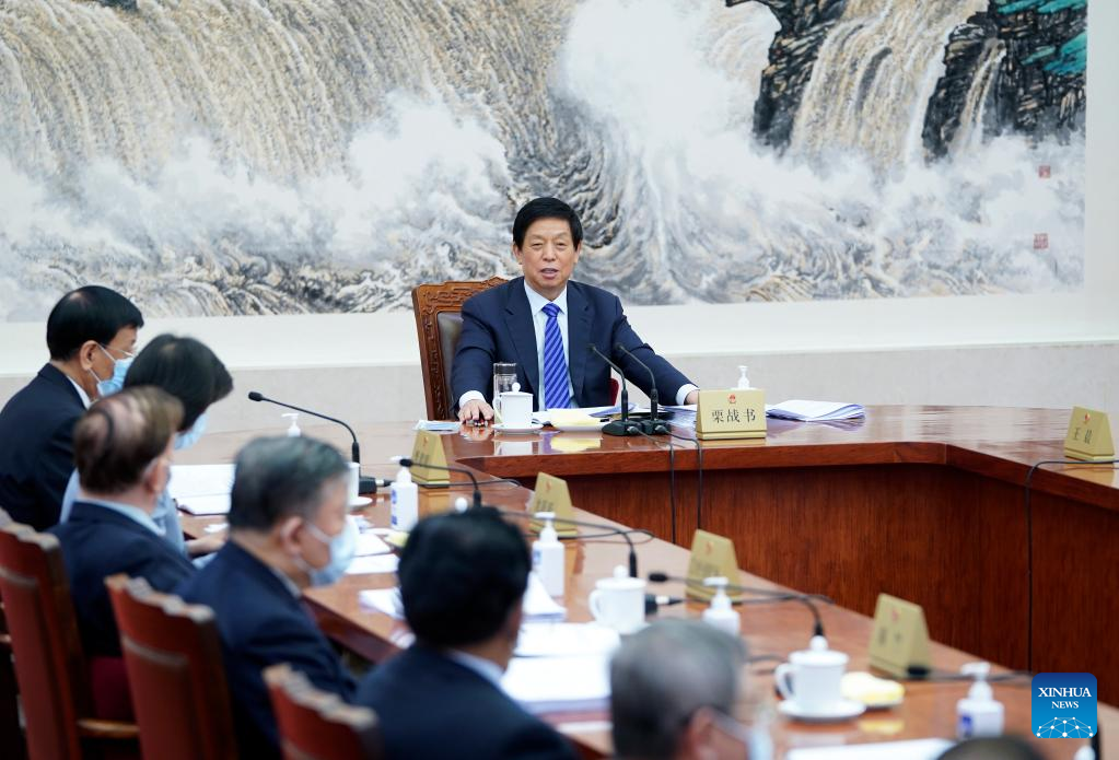 Li Zhanshu, chairman of the National People's Congress (NPC) Standing Committee, presides over the 114th meeting of the Council of Chairpersons of the 13th NPC Standing Committee at the Great Hall of the People in Beijing, capital of China, April 11, 2022. (Xinhua/Zhang Ling)