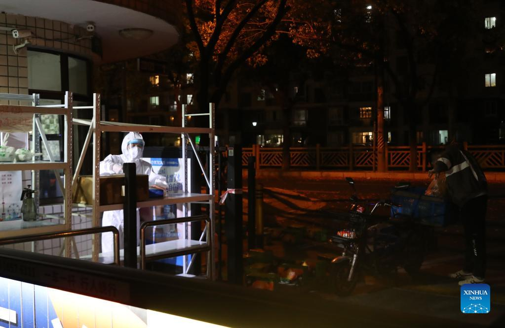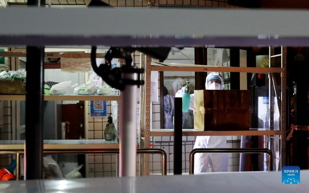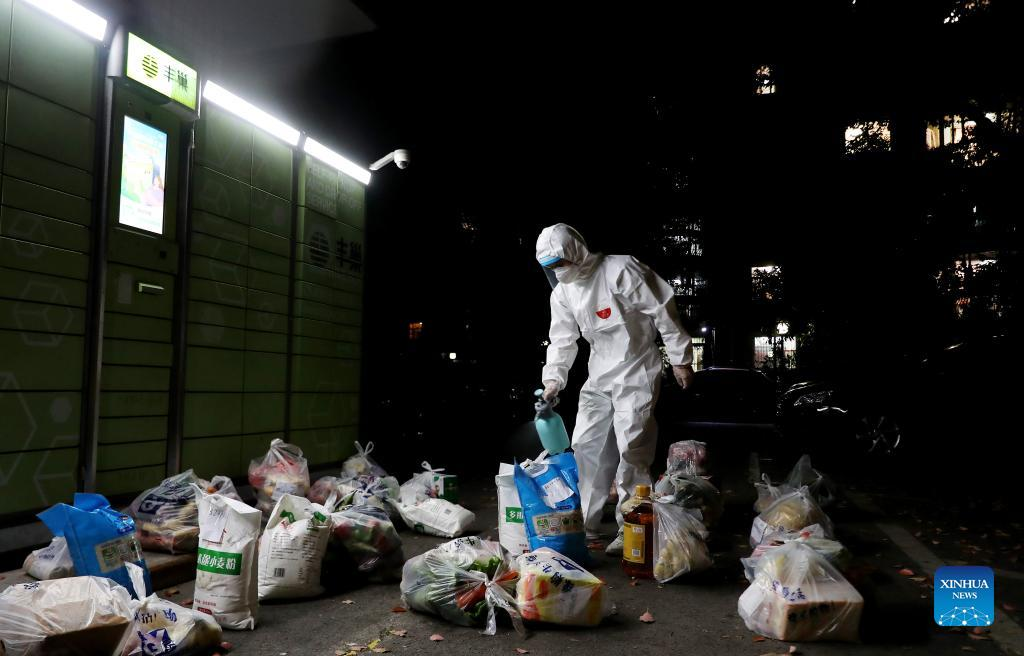Shi Zhongliang sprays disinfectants on the newly-arrived living materials in the evening in east China's Shanghai, April 11, 2022. Shi Zhongliang, a resident of Qibao Township, Minhang District of Shanghai, now renders his service as a volunteer in his community. His residential community has been under closed-off management since March 18 due to the resurgence of COVID-19. Soon after that, Shi joined the community volunteer team spontaneously organized by the residents from the same community. The team, with only seven members from the start, has grown as big as 40 within a month. Shi and his teammates are mainly responsible for delivering the living materials purchased online by the residents. To ensure the safety of the supplies before delivery, the volunteers disinfect every parcel. And the delivery work usually takes them about ten kilometers' shuttling in the neighborhood on a daily basis. (Xinhua/Fang Zhe)