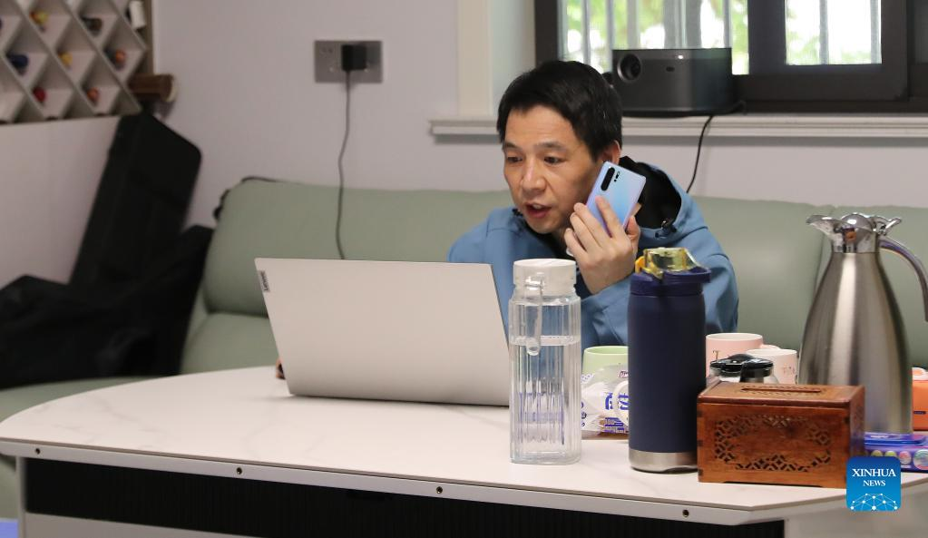 Shi Zhongliang deals with his own work after returning home from the volunteer service in east China's Shanghai, April 11, 2022. Shi Zhongliang, a resident of Qibao Township, Minhang District of Shanghai, now renders his service as a volunteer in his community. His residential community has been under closed-off management since March 18 due to the resurgence of COVID-19. Soon after that, Shi joined the community volunteer team spontaneously organized by the residents from the same community. The team, with only seven members from the start, has grown as big as 40 within a month. Shi and his teammates are mainly responsible for delivering the living materials purchased online by the residents. To ensure the safety of the supplies before delivery, the volunteers disinfect every parcel. And the delivery work usually takes them about ten kilometers' shuttling in the neighborhood on a daily basis. (Xinhua/Fang Zhe)