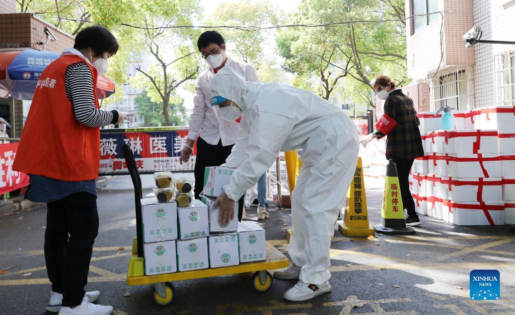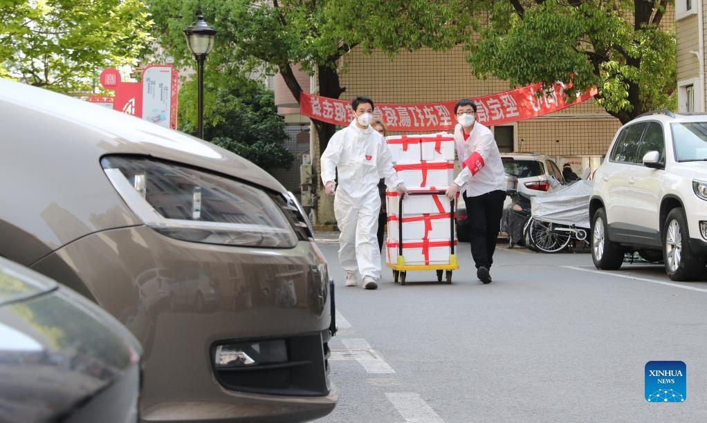 Shi Zhongliang (L) delivers parcels for residents under temporary closed-off management in east China's Shanghai, April 11, 2022. Shi Zhongliang, a resident of Qibao Township, Minhang District of Shanghai, now renders his service as a volunteer in his community. His residential community has been under closed-off management since March 18 due to the resurgence of COVID-19. Soon after that, Shi joined the community volunteer team spontaneously organized by the residents from the same community. The team, with only seven members from the start, has grown as big as 40 within a month. Shi and his teammates are mainly responsible for delivering the living materials purchased online by the residents. To ensure the safety of the supplies before delivery, the volunteers disinfect every parcel. And the delivery work usually takes them about ten kilometers' shuttling in the neighborhood on a daily basis. (Xinhua/Fang Zhe)