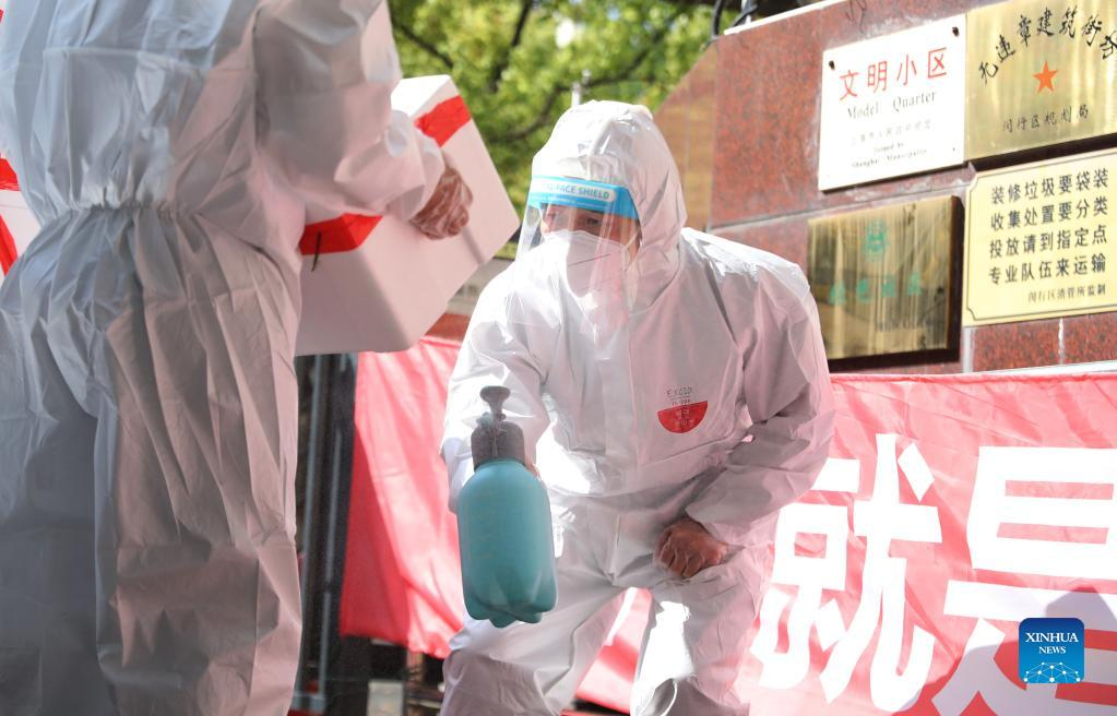 Shi Zhongliang sprays disinfectants on the parcels temporarily stored at the entrance of his residential community in east China's Shanghai, April 11, 2022. Shi Zhongliang, a resident of Qibao Township, Minhang District of Shanghai, now renders his service as a volunteer in his community. His residential community has been under closed-off management since March 18 due to the resurgence of COVID-19. Soon after that, Shi joined the community volunteer team spontaneously organized by the residents from the same community. The team, with only seven members from the start, has grown as big as 40 within a month. Shi and his teammates are mainly responsible for delivering the living materials purchased online by the residents. To ensure the safety of the supplies before delivery, the volunteers disinfect every parcel. And the delivery work usually takes them about ten kilometers' shuttling in the neighborhood on a daily basis. (Xinhua/Fang Zhe)