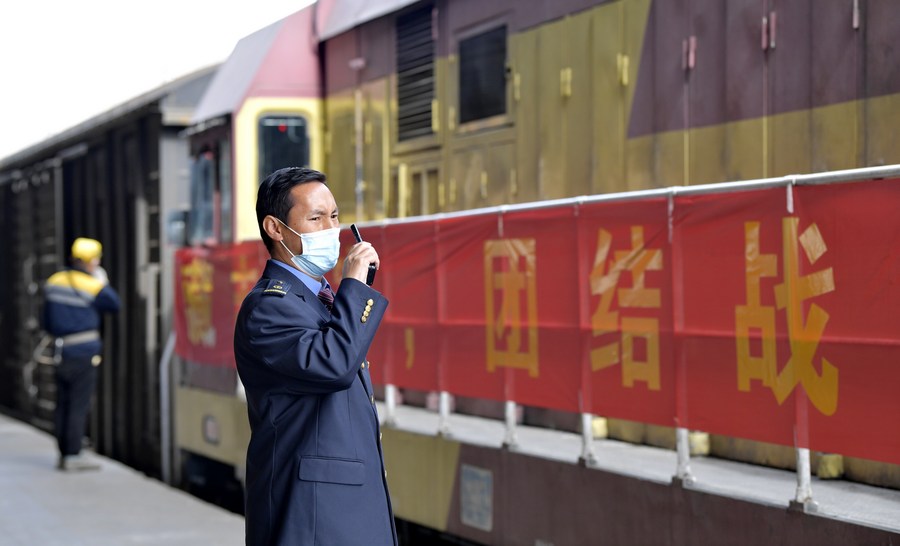 A staff member coordinates with his colleague about the departure of a freight train at a freight station in Lhasa, southwest China's Tibet Autonomous Region, April 10, 2022. (Xinhua/Zhang Rufeng)