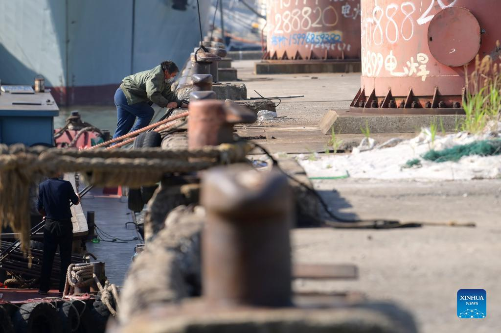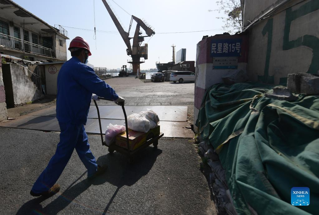 Deliveryman Zhu Yongkang heads to Haibao wharf in Yangpu District, east China's Shanghai, April 11, 2022. On April 10, E-commerce platform Hema Fresh, Alibaba's fresh-food chain, received an online order for food including vegetables, instant noodles, steamed buns and bread which needed to be delivered to Haibao wharf at about 10 kilometers away. Zhu Yongkang, deliveryman of Hema Fresh, decided to send this order although he said that he usually only work within three kilometers around the store. He set off on a delivery bike with a spare battery. He knew that in this special period, every package might help relieve the pressure of people under quarantine. When Zhu arrived at Haibao wharf, he was blocked by a fence. Due to the regulations on epidemic control, deliverymen cannot enter. A manager of the wharf helped him transfer the food package to the consignee Zhang Tonghua. Zhang Tonghua is a cargo ship owner from east China's Jiangsu Province. Due to the prevention and control measures, he could not dock to Shanghai. He had to temporarily moor at the shore close to Haibao wharf, but could not land and purchase daily necessities. He was so excited when receiving the food delivered to him. (Xinhua/Li He)