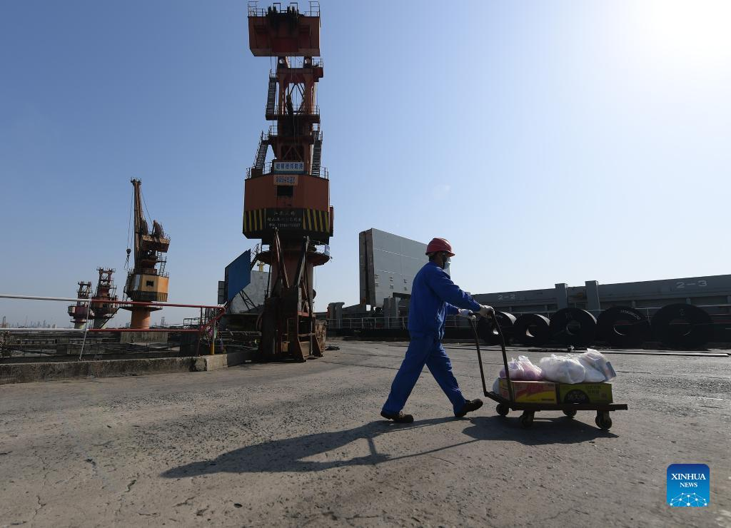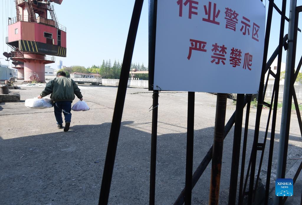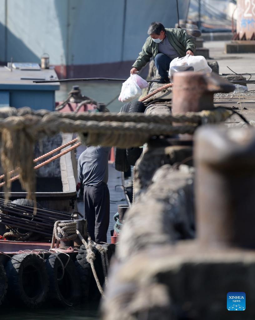Zhang Tonghua carries the food to his ship in east China's Shanghai, April 11, 2022. On April 10, E-commerce platform Hema Fresh, Alibaba's fresh-food chain, received an online order for food including vegetables, instant noodles, steamed buns and bread which needed to be delivered to Haibao wharf at about 10 kilometers away. Zhu Yongkang, deliveryman of Hema Fresh, decided to send this order although he said that he usually only work within three kilometers around the store. He set off on a delivery bike with a spare battery. He knew that in this special period, every package might help relieve the pressure of people under quarantine. When Zhu arrived at Haibao wharf, he was blocked by a fence. Due to the regulations on epidemic control, deliverymen cannot enter. A manager of the wharf helped him transfer the food package to the consignee Zhang Tonghua. Zhang Tonghua is a cargo ship owner from east China's Jiangsu Province. Due to the prevention and control measures, he could not dock to Shanghai. He had to temporarily moor at the shore close to Haibao wharf, but could not land and purchase daily necessities. He was so excited when receiving the food delivered to him. (Xinhua/Li He)