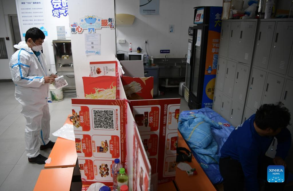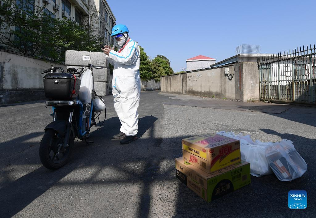 Deliveryman Zhu Yongkang puts on protective suit before leaving a Hema Fresh store in Yangpu District, east China's Shanghai, April 11, 2022. On April 10, E-commerce platform Hema Fresh, Alibaba's fresh-food chain, received an online order for food including vegetables, instant noodles, steamed buns and bread which needed to be delivered to Haibao wharf at about 10 kilometers away. Zhu Yongkang, deliveryman of Hema Fresh, decided to send this order although he said that he usually only work within three kilometers around the store. He set off on a delivery bike with a spare battery. He knew that in this special period, every package might help relieve the pressure of people under quarantine. When Zhu arrived at Haibao wharf, he was blocked by a fence. Due to the regulations on epidemic control, deliverymen cannot enter. A manager of the wharf helped him transfer the food package to the consignee Zhang Tonghua. Zhang Tonghua is a cargo ship owner from east China's Jiangsu Province. Due to the prevention and control measures, he could not dock to Shanghai. He had to temporarily moor at the shore close to Haibao wharf, but could not land and purchase daily necessities. He was so excited when receiving the food delivered to him. (Xinhua/Li He)
