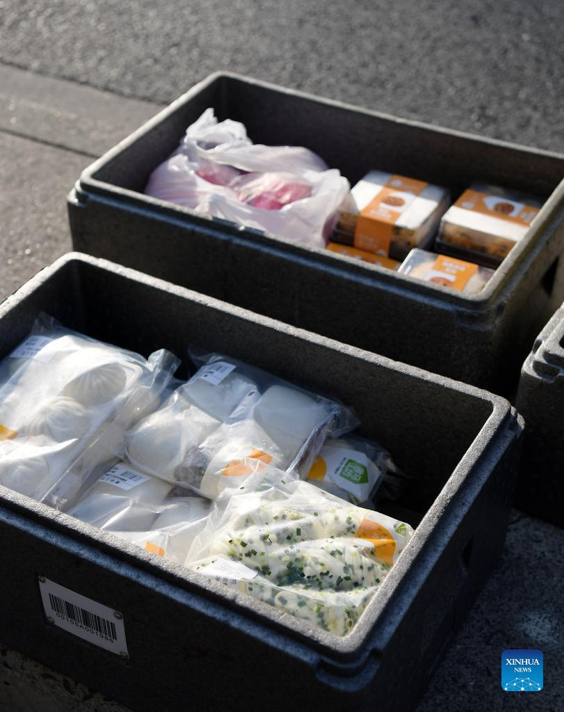 Photo taken on April 11, 2022 shows the food ordered by Zhang Tonghua in Yangpu District, east China's Shanghai. On April 10, E-commerce platform Hema Fresh, Alibaba's fresh-food chain, received an online order for food including vegetables, instant noodles, steamed buns and bread which needed to be delivered to Haibao wharf at about 10 kilometers away. Zhu Yongkang, deliveryman of Hema Fresh, decided to send this order although he said that he usually only work within three kilometers around the store. He set off on a delivery bike with a spare battery. He knew that in this special period, every package might help relieve the pressure of people under quarantine. When Zhu arrived at Haibao wharf, he was blocked by a fence. Due to the regulations on epidemic control, deliverymen cannot enter. A manager of the wharf helped him transfer the food package to the consignee Zhang Tonghua. Zhang Tonghua is a cargo ship owner from east China's Jiangsu Province. Due to the prevention and control measures, he could not dock to Shanghai. He had to temporarily moor at the shore close to Haibao wharf, but could not land and purchase daily necessities. He was so excited when receiving the food delivered to him. (Xinhua/Li He)