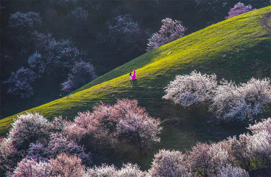 Spring is the best season for tourists to hike in the wild apricot forests of the Narathi Apricot Valley, Xinyuan county, northwest China's Xinjiang Uygur Autonomous Region. (Photo/Yang Xiaoqian)