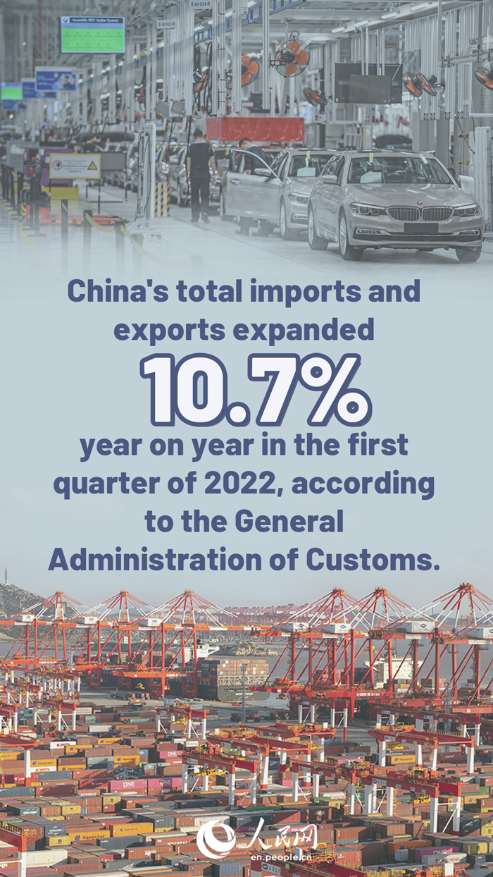 China's total imports and exports expanded 10.7 percent year on year to 9.42 trillion yuan (1.48 trillion U.S. dollars) in the first quarter of 2022, official data showed Wednesday.