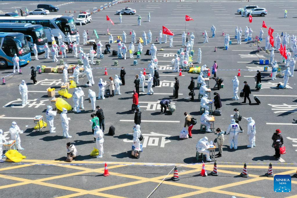 Aerial photo taken on April 12, 2022 shows farmers returning home for spring farming line up to have their health codes checked before boarding buses at a highway exit in Changchun City, northeast China's Jilin Province. Northeast China's Jilin Province, a major grain producer now fighting a COVID-19 outbreak, is issuing travel passes for farmers and sending them to farmland in chartered buses. By Sunday evening, around 100,000 farmers had reached their destinations. (Xinhua)