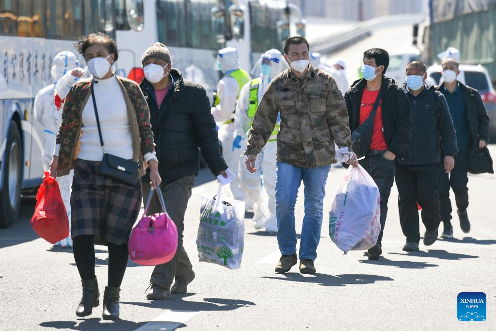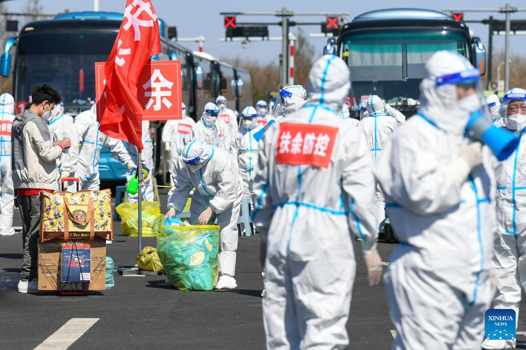 Farmers returning home for spring farming line up to board the chartered buses at a highway exit in Changchun City, northeast China's Jilin Province, April 12, 2022. Northeast China's Jilin Province, a major grain producer now fighting a COVID-19 outbreak, is issuing travel passes for farmers and sending them to farmland in chartered buses. By Sunday evening, around 100,000 farmers had reached their destinations. (Xinhua)