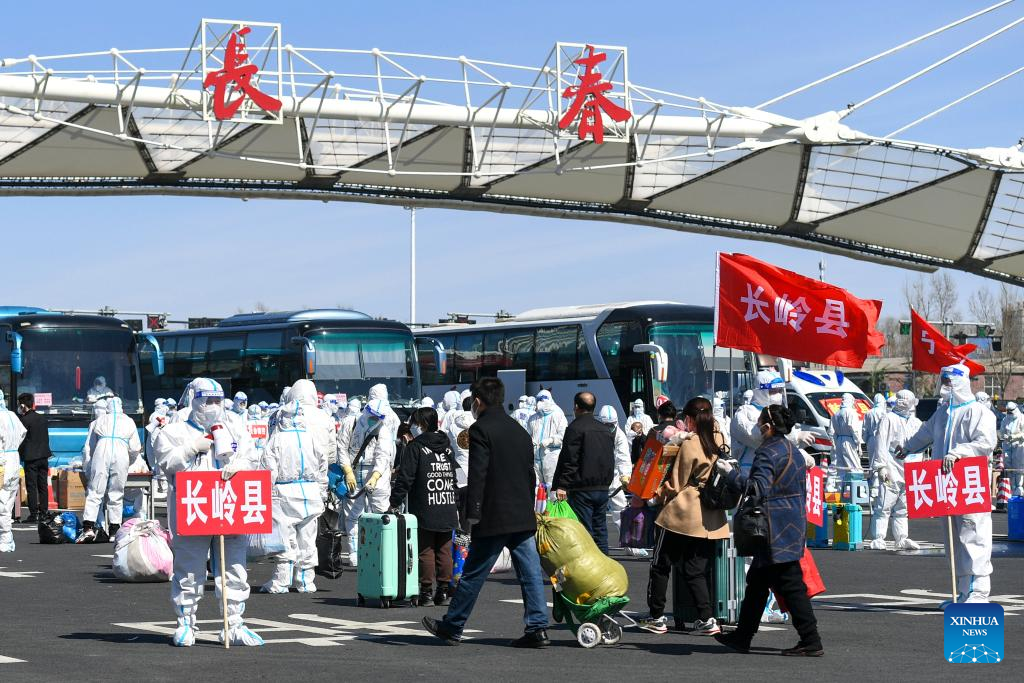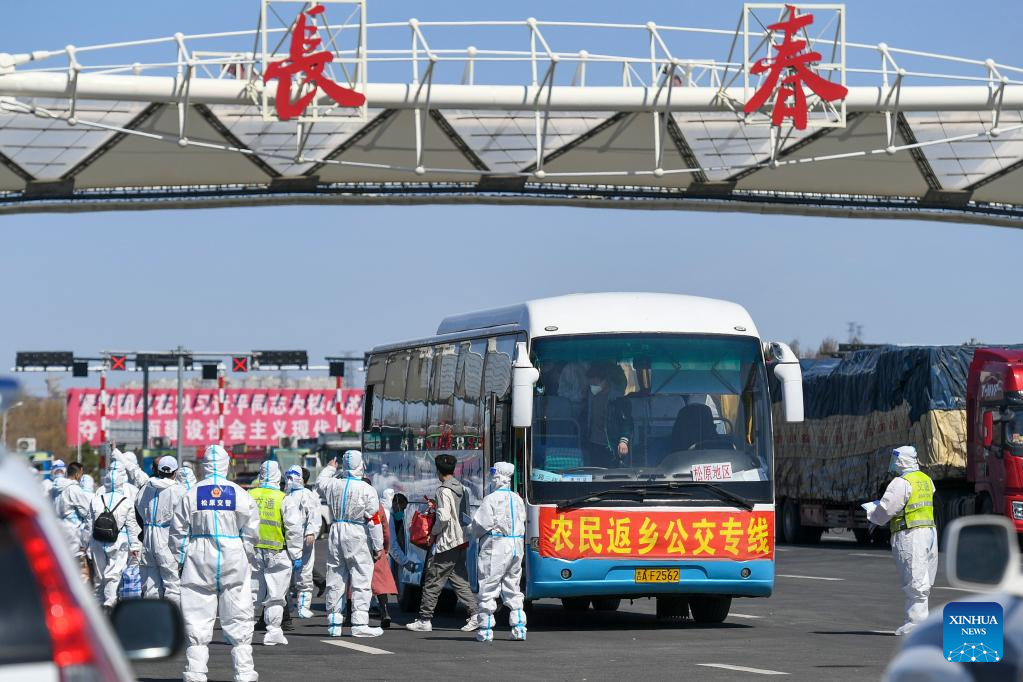 Farmers return home for spring farming by chartered buses in NE China's Jilin
