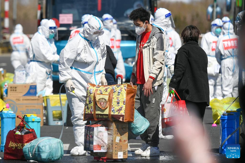 Farmers returning home for spring farming line up to board a chartered bus at a highway exit in Changchun City, northeast China's Jilin Province, April 12, 2022. Northeast China's Jilin Province, a major grain producer now fighting a COVID-19 outbreak, is issuing travel passes for farmers and sending them to farmland in chartered buses. By Sunday evening, around 100,000 farmers had reached their destinations. (Xinhua)