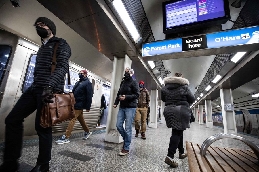People wearing face masks walk past a subway train in Chicago, the United States, on Feb. 28, 2022. (Photo by Vincent D. Johnson/Xinhua)