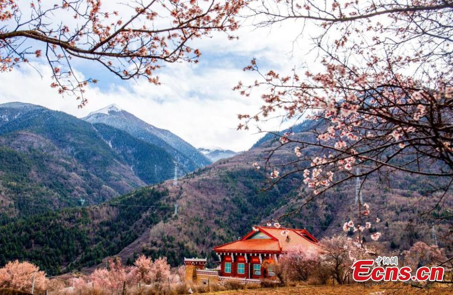 Beautiful Tibetan village decorated with pink apricot blossoms is seen in Ganzi Tibetan Autonomous Prefecture, southwest China's Sichuan Province. (Photo: China News Service/He Xingming)