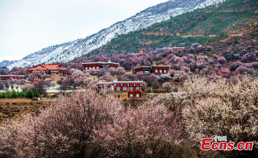 Beautiful Tibetan village decorated with pink apricot blossoms is seen in Ganzi Tibetan Autonomous Prefecture, southwest China's Sichuan Province. (Photo: China News Service/He Xingming)