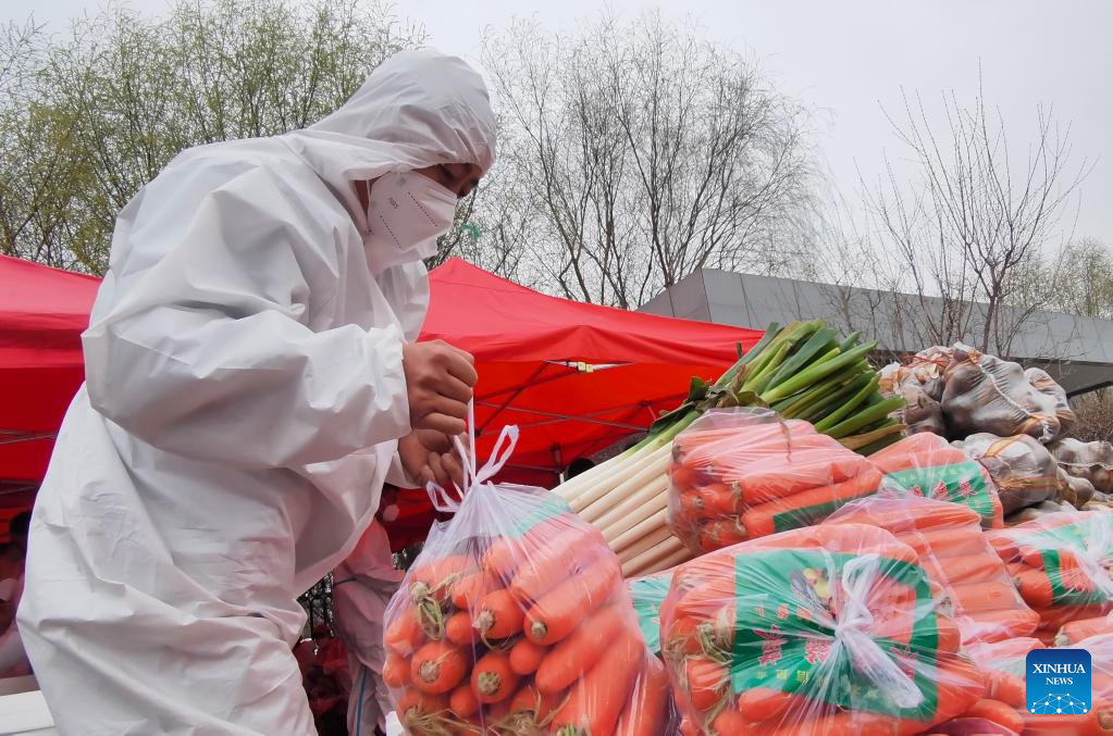 Volunteers transport vegetable in an agricultural products distribution center in Shenyang, northeast China's Liaoning Province, April 11, 2022. The commercial department of Liaoning organized about 2,300 tons of rice, flour, cooking oil, vegetables and other food for citizens in Shanghai to overcome a local COVID-19 resurgence. The first batch of 900 tons of living materials were shipped from Dalian on Tuesday. (Xinhua)