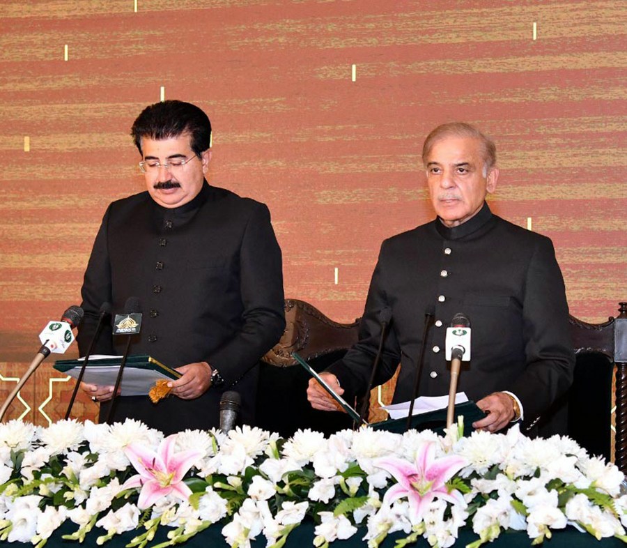 Photo released by Pakistan's Press Information Department (PID) shows Shahbaz Sharif (R) taking the oath as the 23rd Prime Minister of Pakistan during a ceremony held at the President House in Islamabad, capital of Pakistan on April 11, 2022. (PID/Handout via Xinhua)