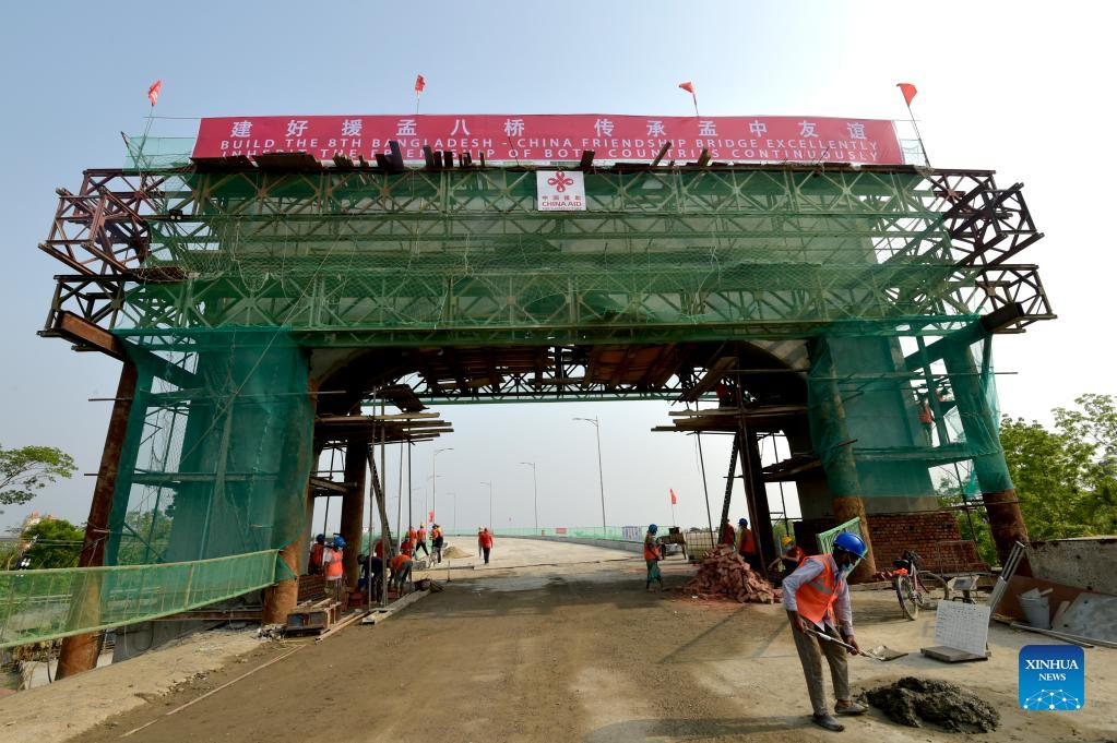 Photo taken on March 23, 2022 shows an Islamic structural design at the main gate of the eighth Bangladesh-China Friendship Bridge under construction in Pirojpur, Bangladesh. China Railway 17th Bureau Group Co. Ltd. is constructing the bridge over Kocha River in Pirojpur district, 185 km southwest of Dhaka, under the management of China Railway Major Bridge Reconnaissance &Design Institute Co. Ltd. (Xinhua)