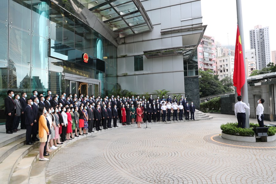 A national flag-raising ceremony is held by the Office of the Commissioner of the Chinese Foreign Ministry in the Hong Kong Special Administrative Region (HKSAR) in Hong Kong, south China, July 1, 2021. (Xinhua)