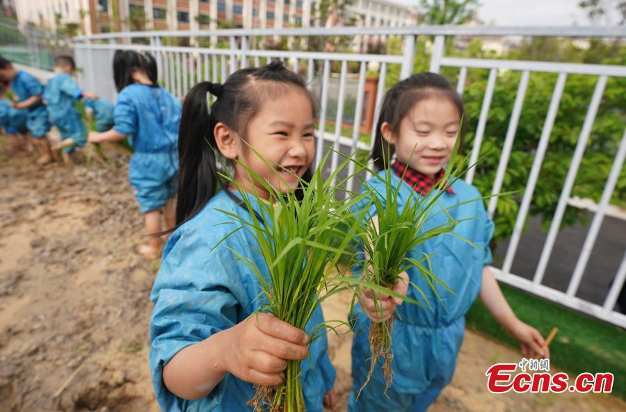Children learn to transplant rice seedlings at a kindergarten at Xinyu, east China's Jiangxi Province, April 14, 2022. (Photo: China News Service/Zhao Chunliang)