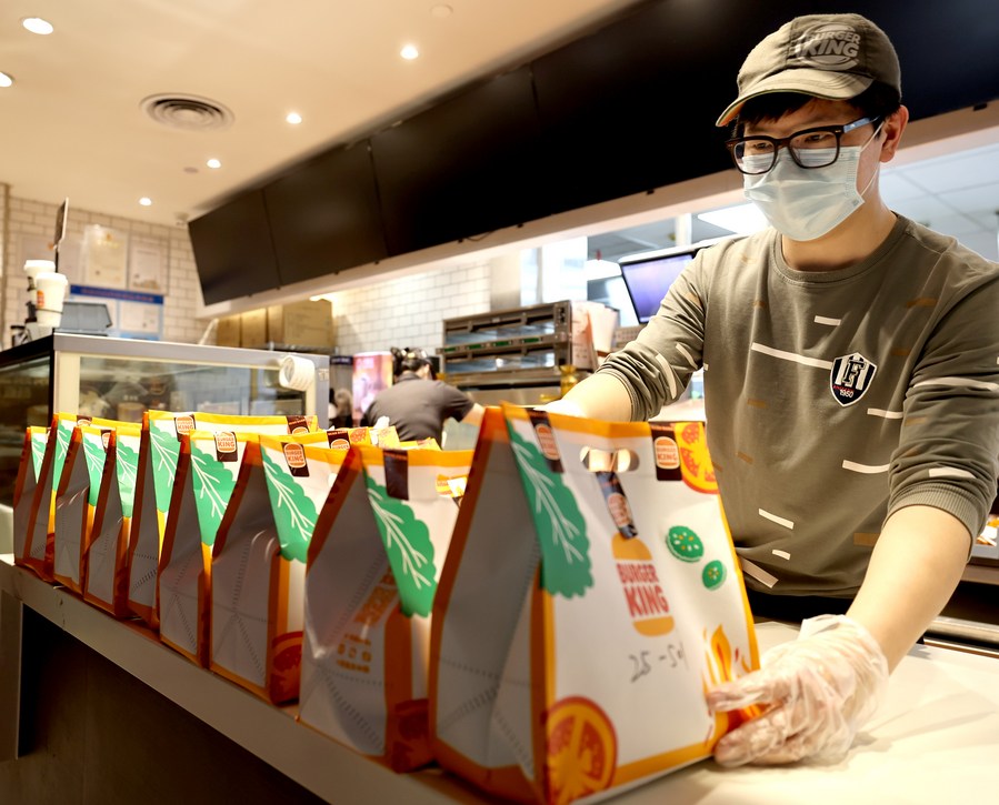 An employee prepares online orders for delivery at a Burger King store in east China's Shanghai, April 10, 2022. (Xinhua/Chen Jianli)