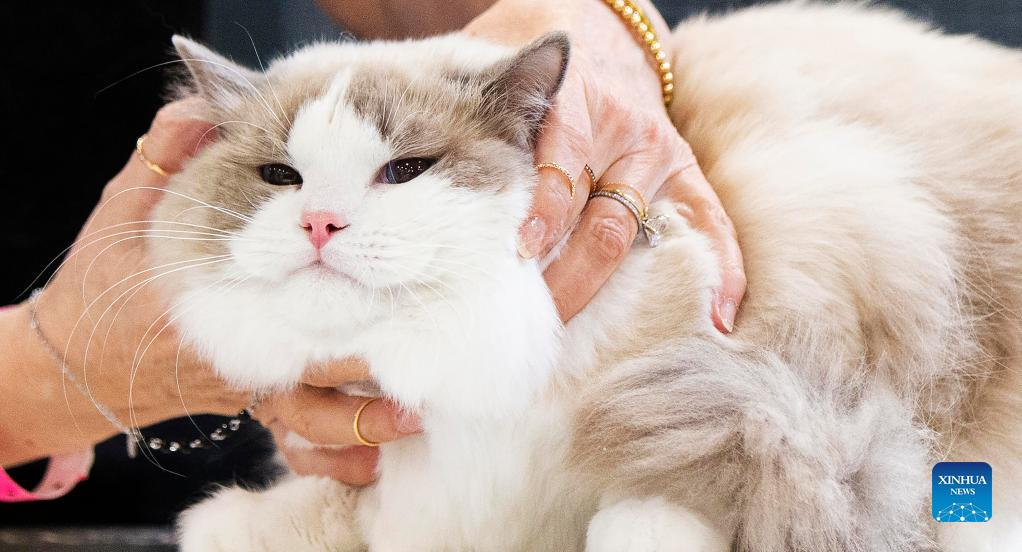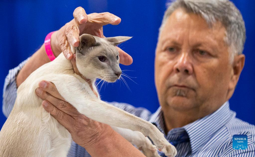 A judge checks a pet cat during the 2022 Spring Canadian Pet Expo in Mississauga, the Greater Toronto Area, Canada, on April 15, 2022. Featuring a pet market, competitions, photo booths and more, the annual event is held here from Friday to Sunday. (Photo by Zou Zheng/Xinhua)