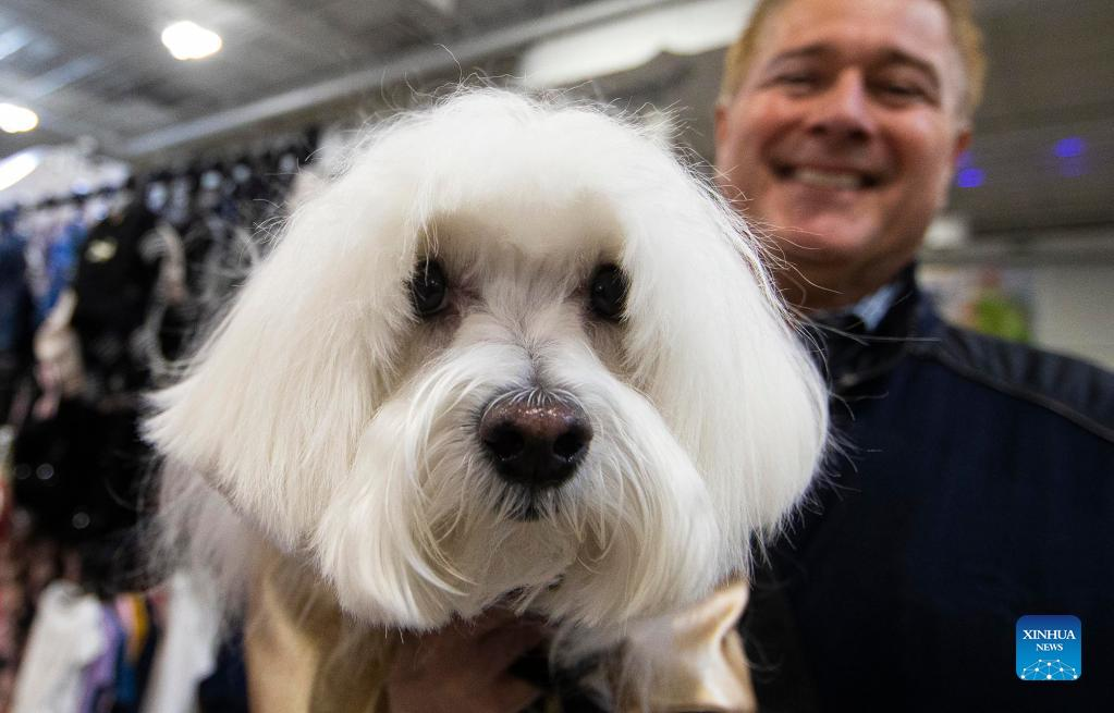 A man shows a groomed pet dog during the 2022 Spring Canadian Pet Expo in Mississauga, the Greater Toronto Area, Canada, on April 15, 2022. Featuring a pet market, competitions, photo booths and more, the annual event is held here from Friday to Sunday. (Photo by Zou Zheng/Xinhua)