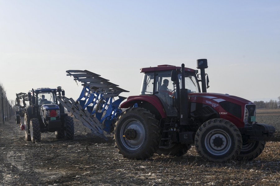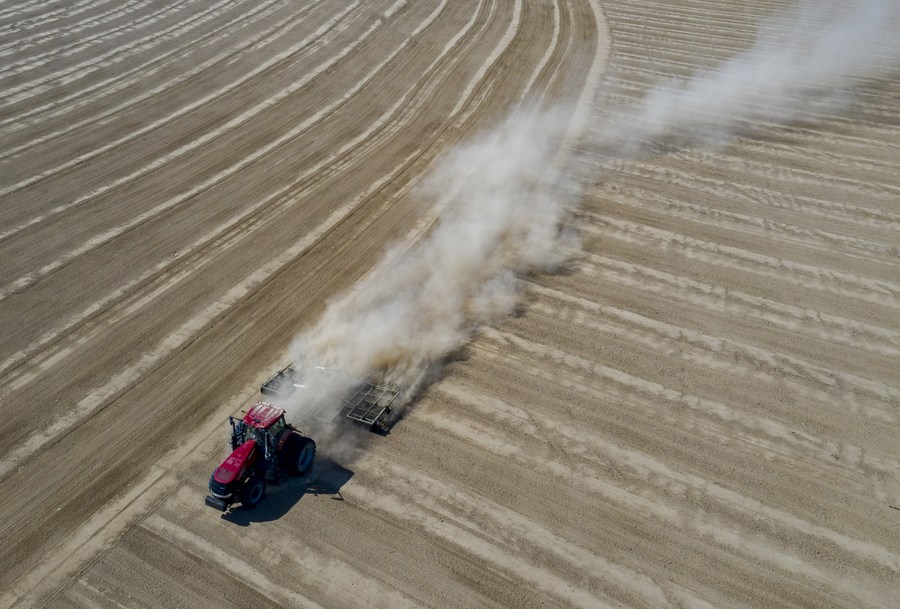 Tractors plow in a cotton field in Shiqiao Township of Usu City, northwest China's Xinjiang Uygur Autonomous Region, March 31, 2022. (Xinhua/Zhao Ge)