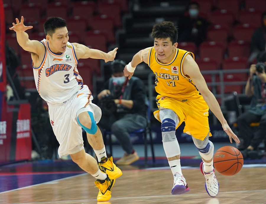 Sun Minghui (R) of Zhejiang Lions breaks through during the semifinal against Shanghai Sharks in the 2021-2022 Chinese Basketball Association (CBA) season in Nanchang, east China's Jiangxi Province, April 17, 2022. (Xinhua/Wan Xiang)