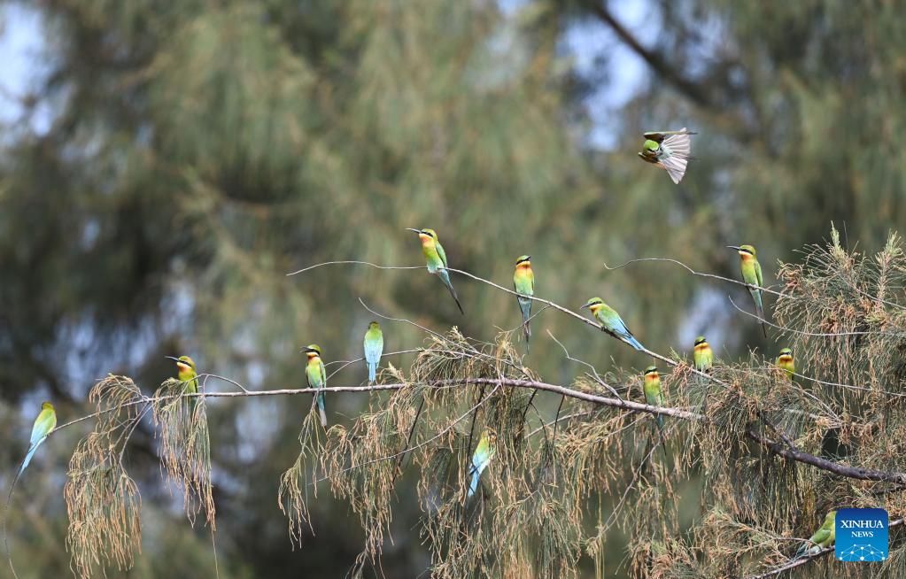 Blue-tailed bee eaters are seen in Haikou, south China's Hainan Province, April 15, 2022. Local authorities of Haikou have made full preparations for bee eaters to build a better habitat during their breeding season. (Xinhua/Yang Guanyu)