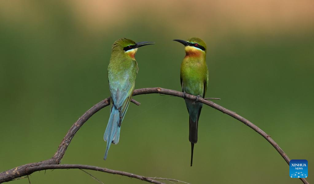 Blue-tailed bee eaters are seen in Haikou, south China's Hainan Province, April 16, 2022. Local authorities of Haikou have made full preparations for bee eaters to build a better habitat during their breeding season. (Xinhua/Yang Guanyu)