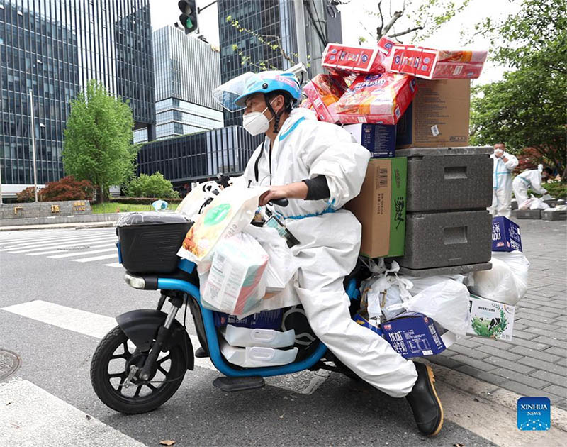 SHANGHAI, April 16 (Xinhua) -- Shanghai is working hard to overcome bottlenecks in logistics and help e-commerce platforms increase production and transport capacity amid strong COVID-19 flare-ups.