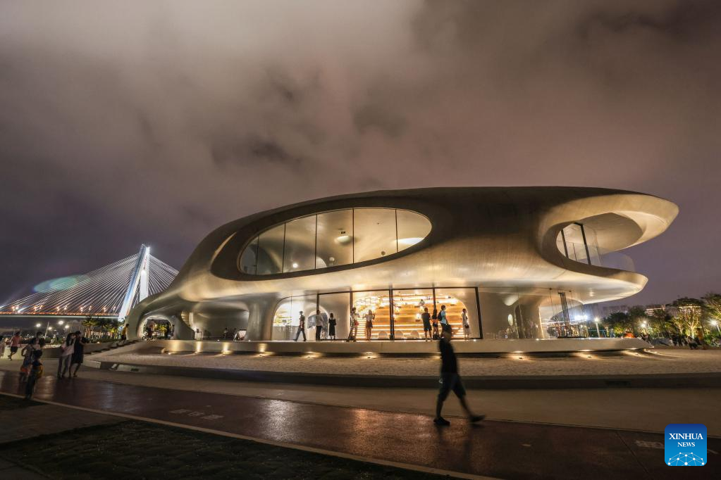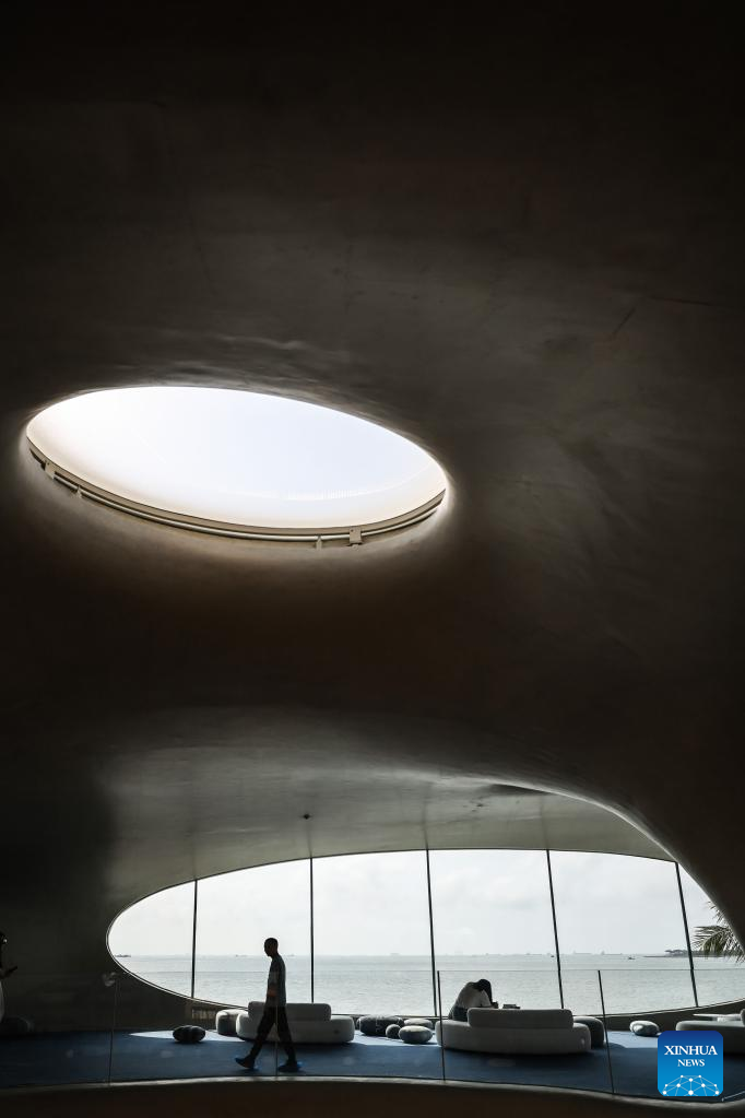 Photo taken on April 15, 2022 shows the Wormhole Library in the Haikou Bay in Haikou, south China's Hainan Province. (Xinhua/Zhang Liyun)