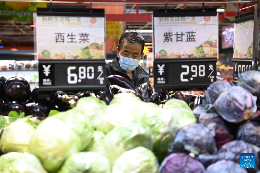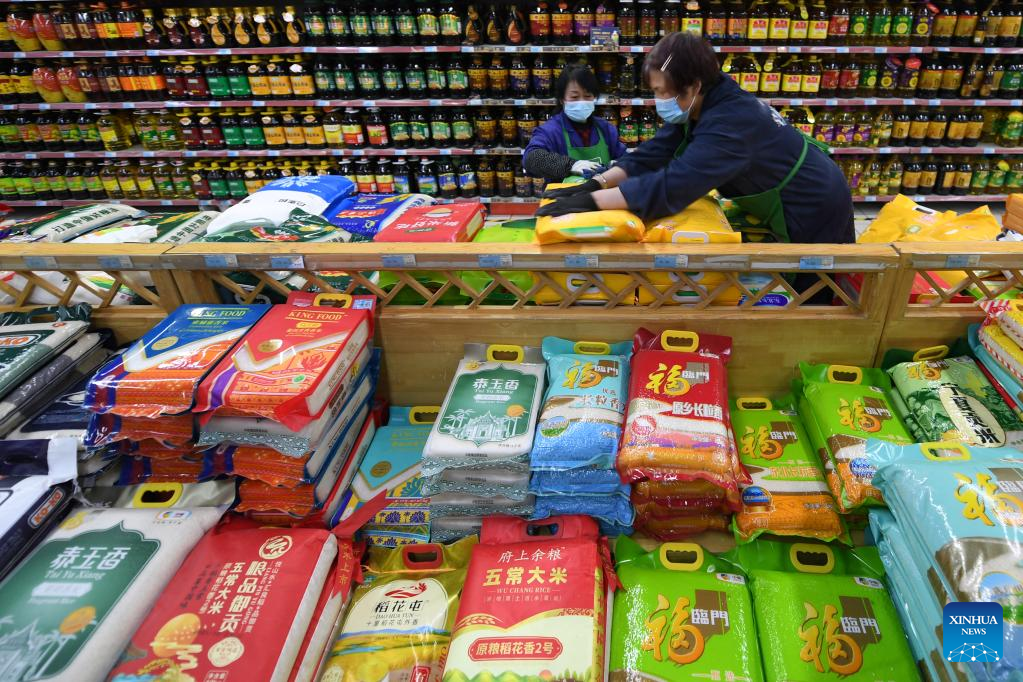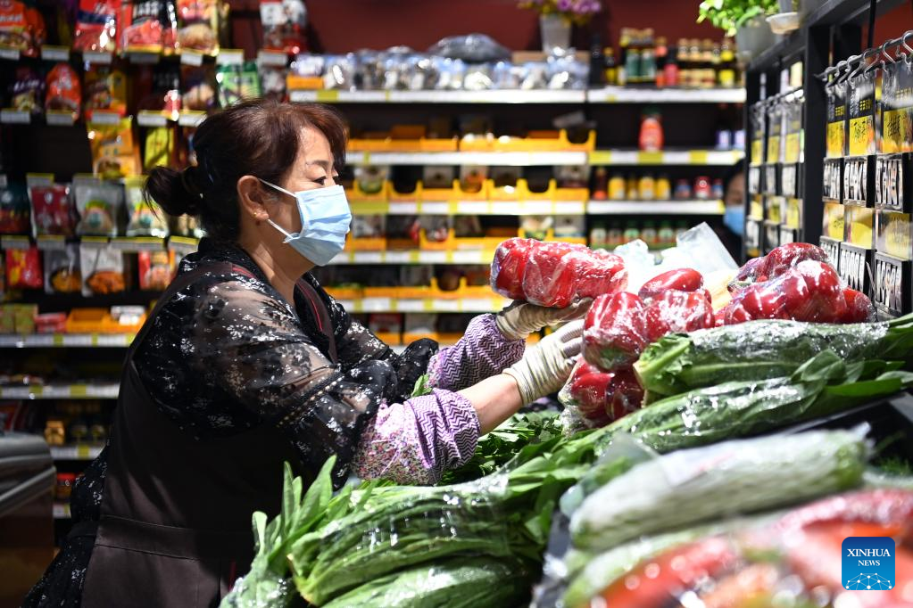 Citizens shop at a supermarket in Chengxi District of Xining City, northwest China's Qinghai Province, April 18, 2022. Local authorities have taken measures to ensure supplies and meanwhile they set up teams to purchase and distribute living supplies for residents in the controlled communities amid the latest resurgence of COVID-19 infections. (Xinhua/Fan Peishen)