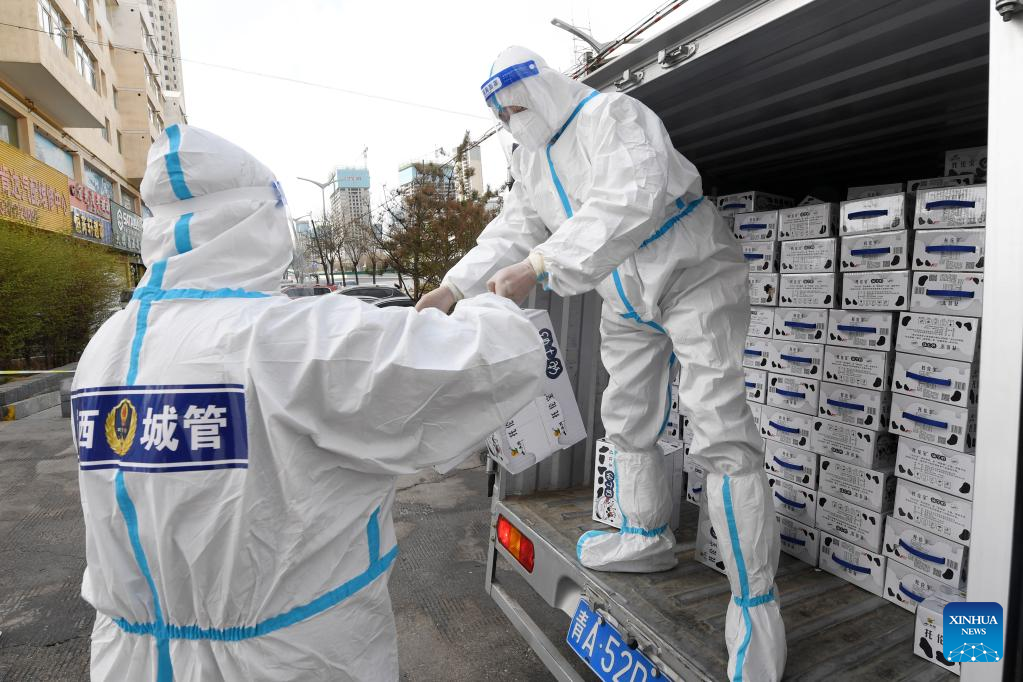 Staff members deliver living supplies for residents of a community in Chengxi District of Xining City, northwest China's Qinghai Province, April 18, 2022. Local authorities have taken measures to ensure supplies and meanwhile they set up teams to purchase and distribute living supplies for residents in the controlled communities amid the latest resurgence of COVID-19 infections. (Xinhua/Fan Peishen)