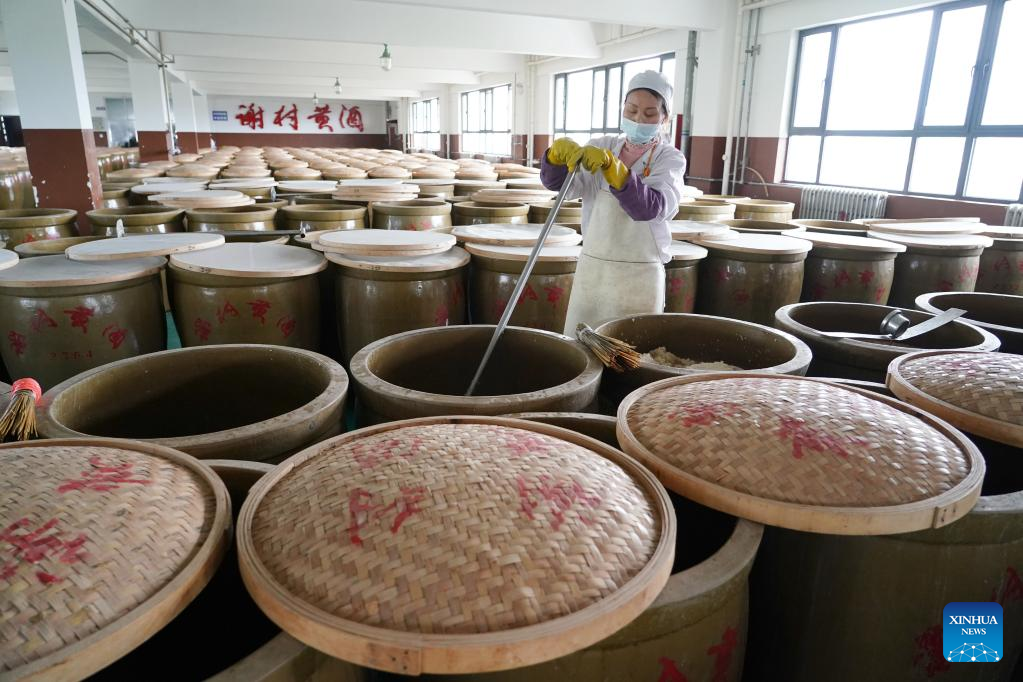 A woman works at a wine factory in Yangxian County of Hanzhong, northwest China's Shaanxi Province, April 16, 2022. Yangxian County, dubbed the "hometown of the crested ibis", has boosted its green economy to create a good habitat for crested ibis while developing the economy. (Xinhua/Shao Rui)