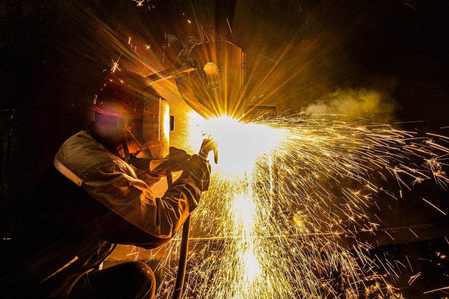 A worker welds at a workshop in Shenyang, capital of northeast China's Liaoning Province, March 24, 2022. (Xinhua)