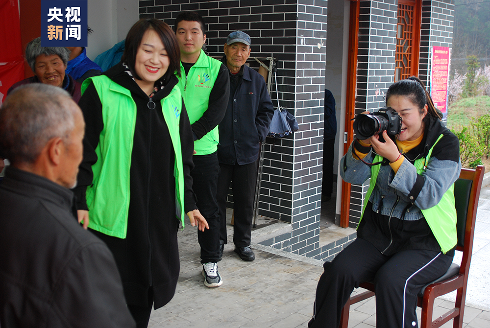 Photo shows Yang Xin taking photos for an elderly resident. (Photo/CCTV)