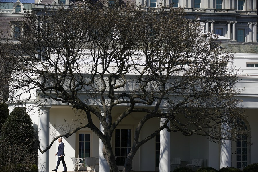 U.S. President Joe Biden walks on the South Lawn to board Marine One at the White House in Washington, D.C. March 11, 2022. (Photo by Ting Shen/Xinhua)